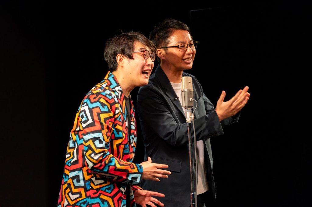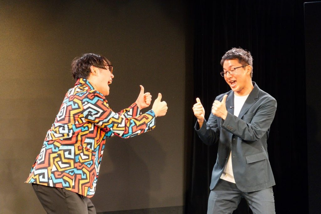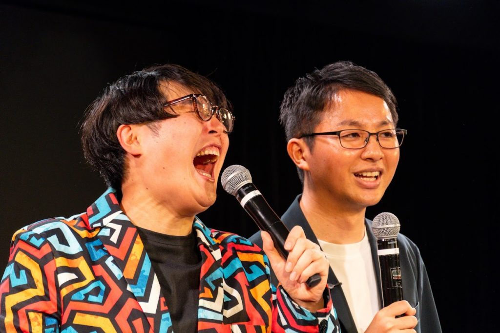 AI翻訳を題材にした漫才からスタート。テクノロジーをテーマにした掛け合いで親子約90名の緊張をほぐしながら、笑いの中に“考えるきっかけ”を織り込みました。トークでは、オシエルズの2人が子どもの頃に体型や見た目をからかわれて傷ついた経験を起点に、笑いは自分だけでなく人のために行うもの、自分だけが楽しいものは“ふざけ”に近いと語りました。