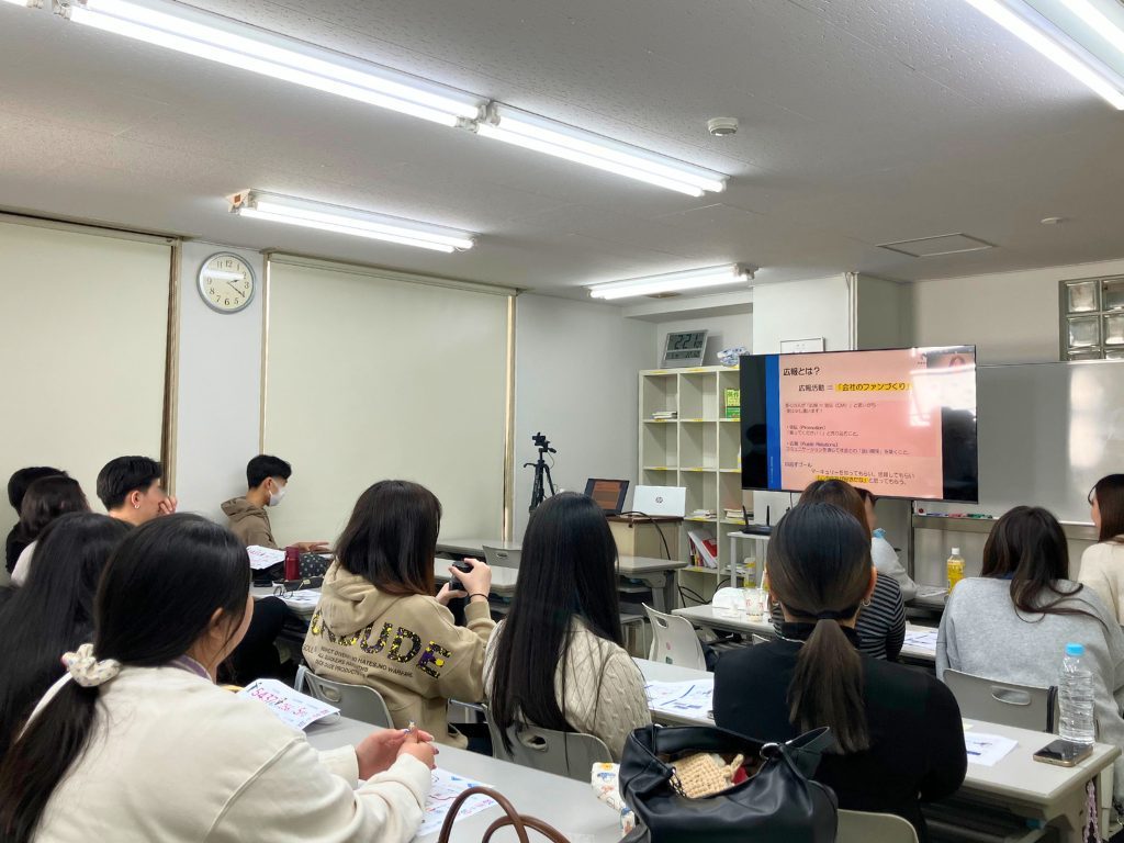 今回はマーケティングを学ぶ2年生の皆さんに向けて、採用広報やSNS活用について、マーキュリーでの実際の取り組みや事例を交えながらお話ししました。